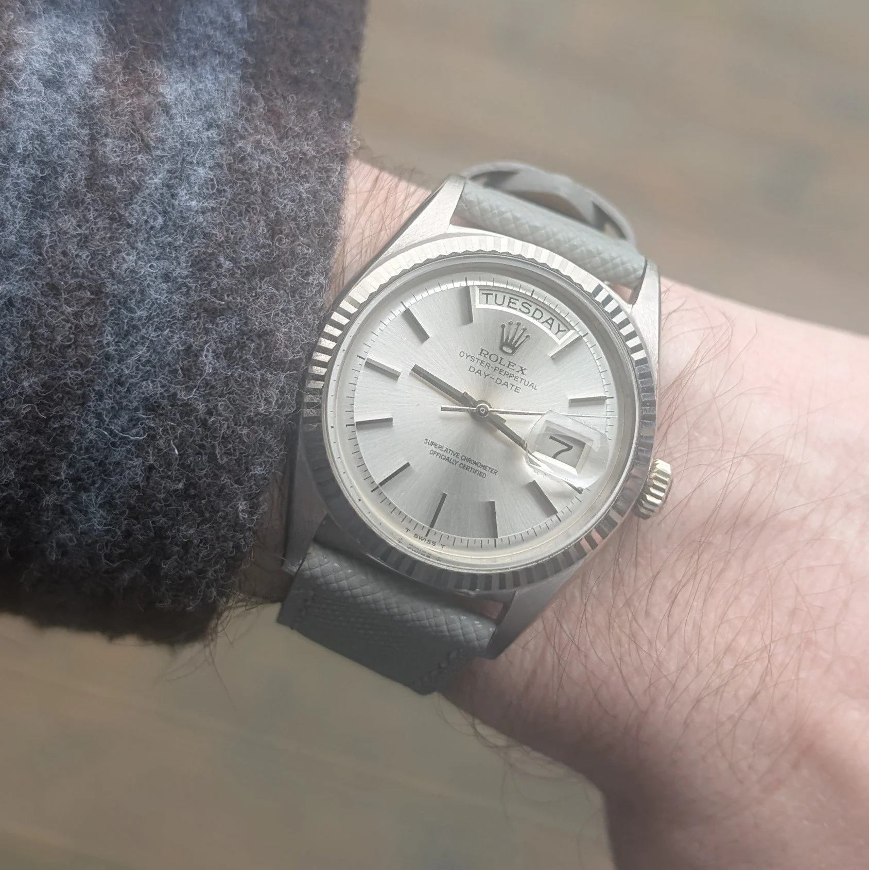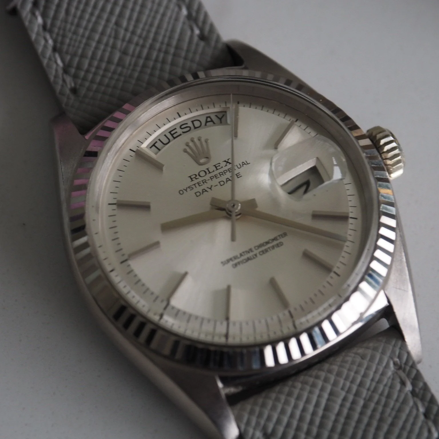 The silver sunburst dial is in remarkable condition, with crisp printing, clean baton markers and a sharp day and date aperture. This no lume dial variant is far less commonly seen than champagne examples and works particularly well with the white gold case. Overall presentation is excellent and clearly the result of careful ownership.