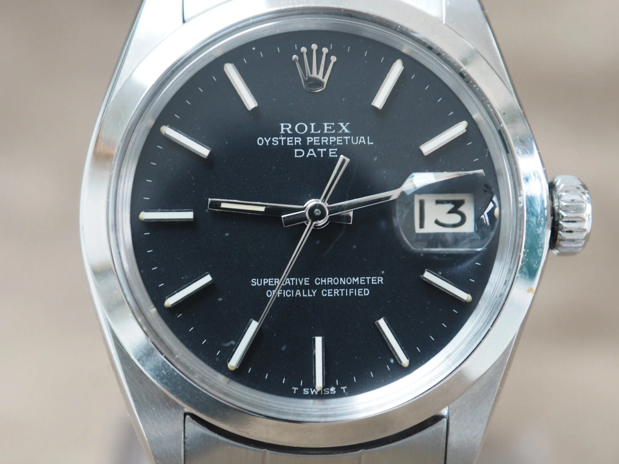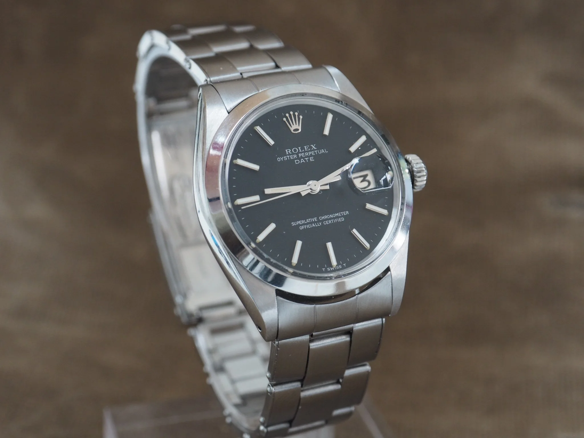 The watch features a beautiful original black dial with applied baton hour markers and lume plots, signed Rolex Oyster Perpetual Date with Superlative Chronometer Officially Certified text above 6. The dial is clean and honest with the classic T Swiss T signature at the bottom and sits beneath the acrylic crystal with cyclops.