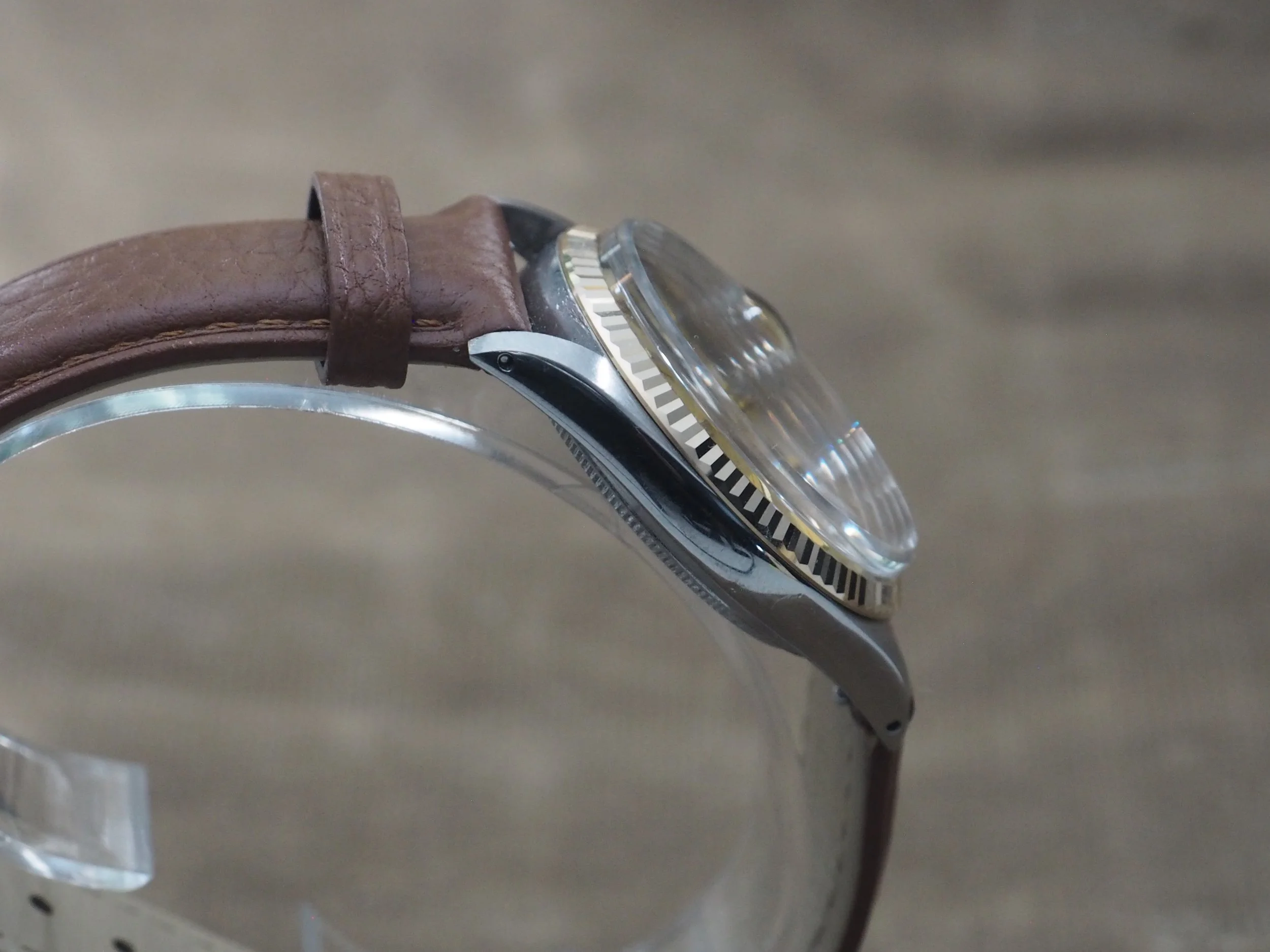Fitted with a new aftermarket brown leather strap and Rolex style buckle as shown. No box or papers included.