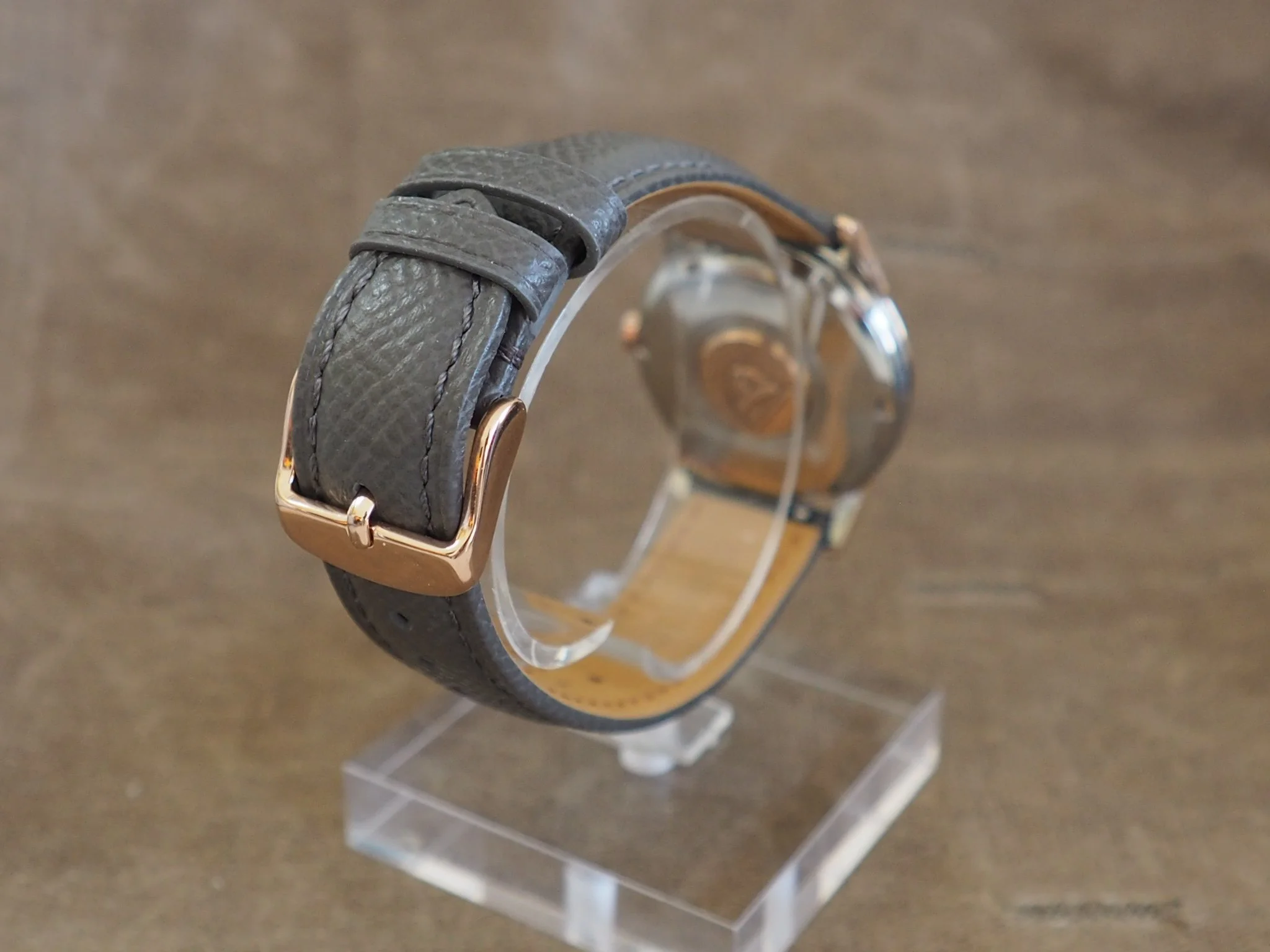 It comes on a brand new textured grey leather strap with an aftermarket rose gold coloured buckle, which works well with the tone of the case.