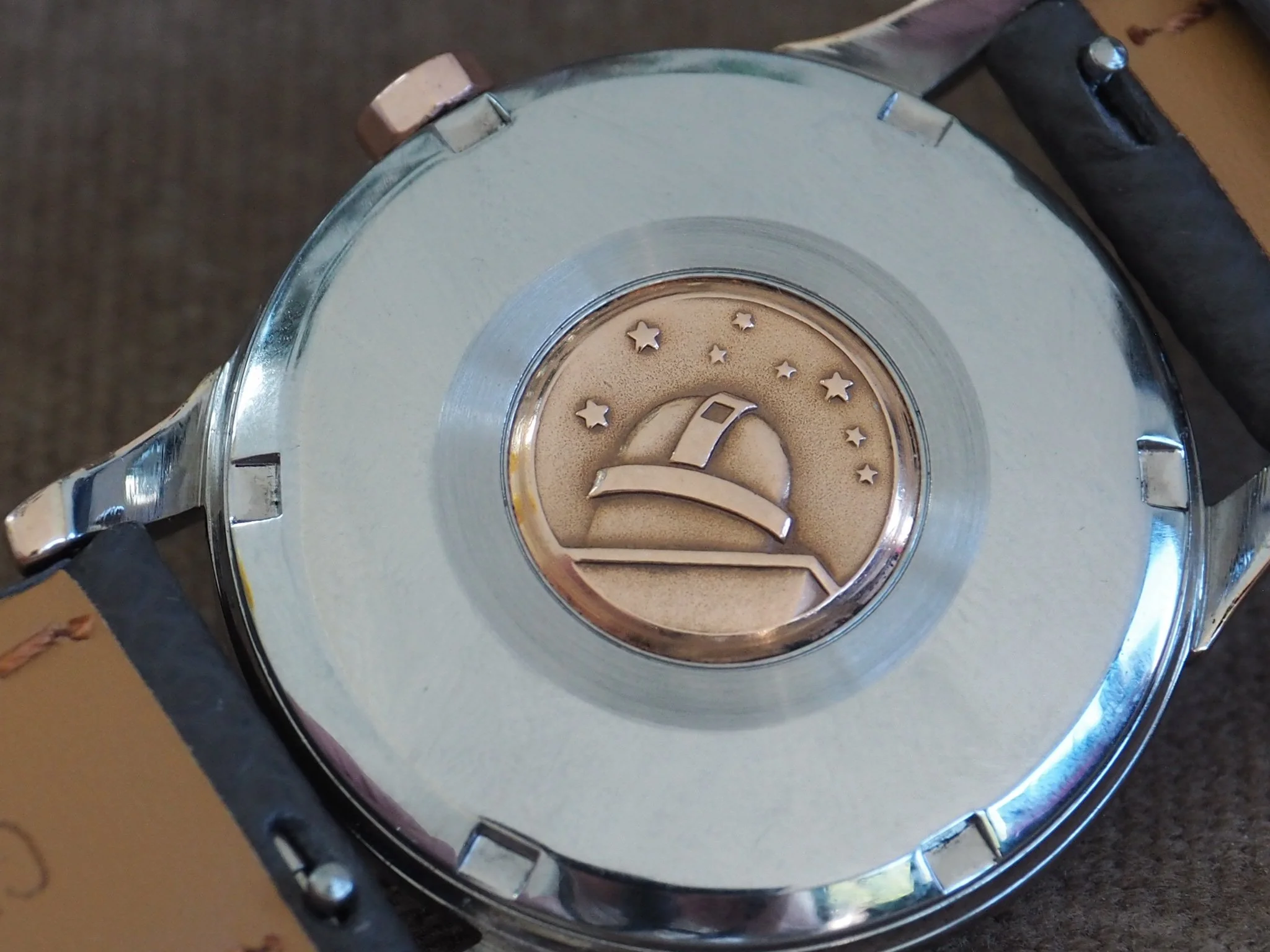 On the back, the observatory medallion. The eight stars reference Omega’s chronometer records at observatory trials — not decoration, but a direct link to what the watch was built to represent. Still crisp.