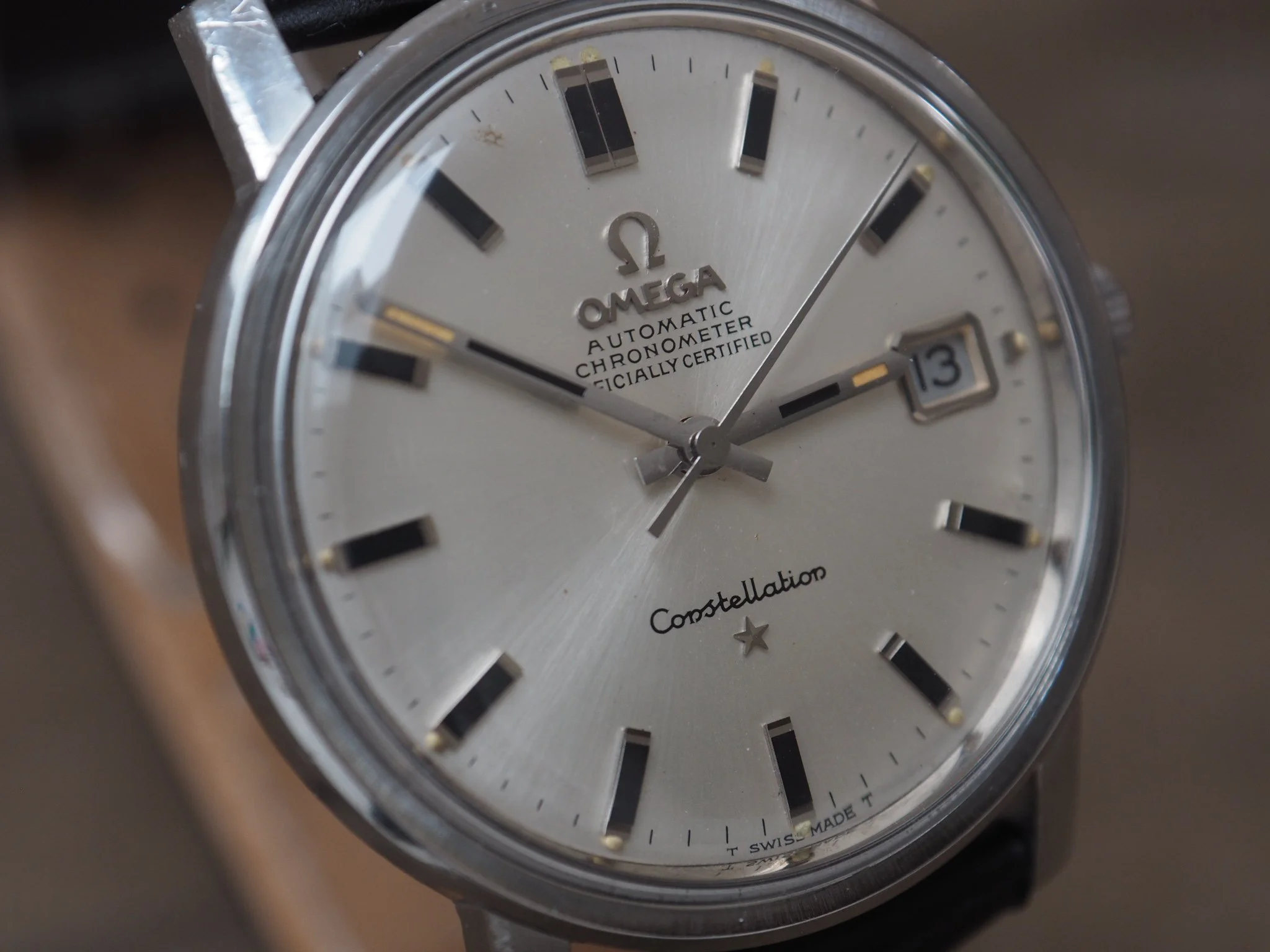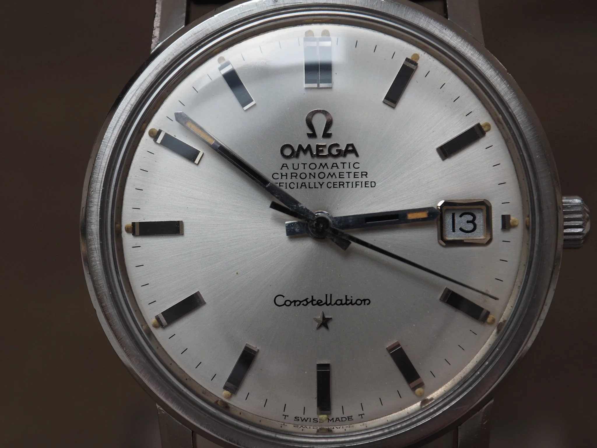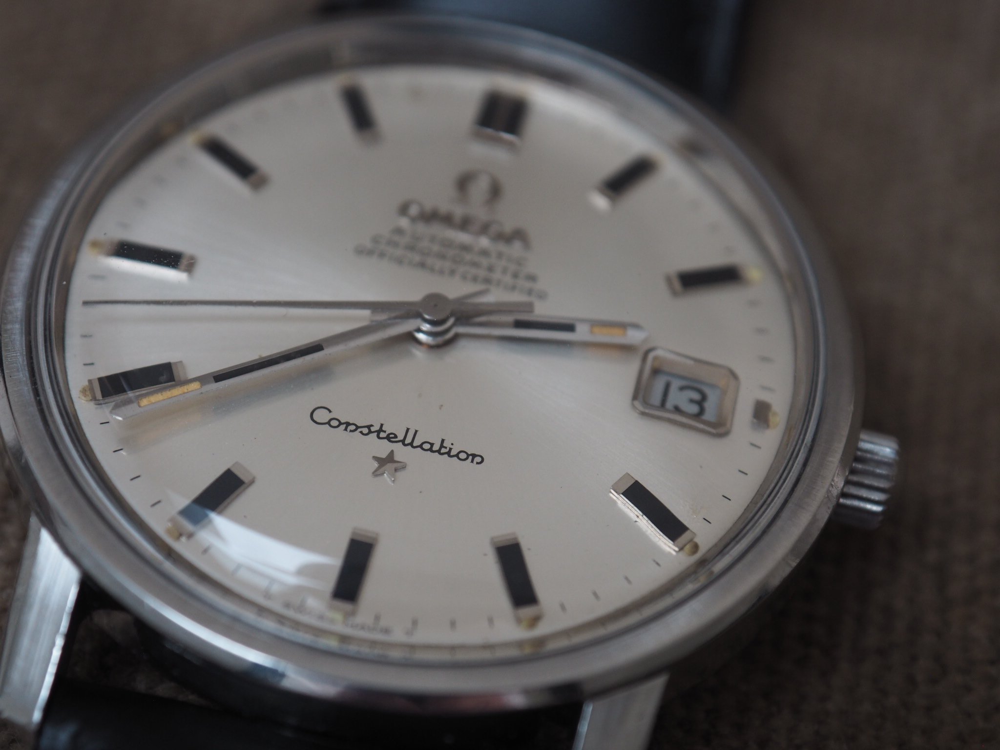 The silver sunburst dial is near mint, with only a small mark visible at the top left. Applied baton markers with black inserts, applied Omega logo, chronometer text and Constellation star are all crisp and well preserved.