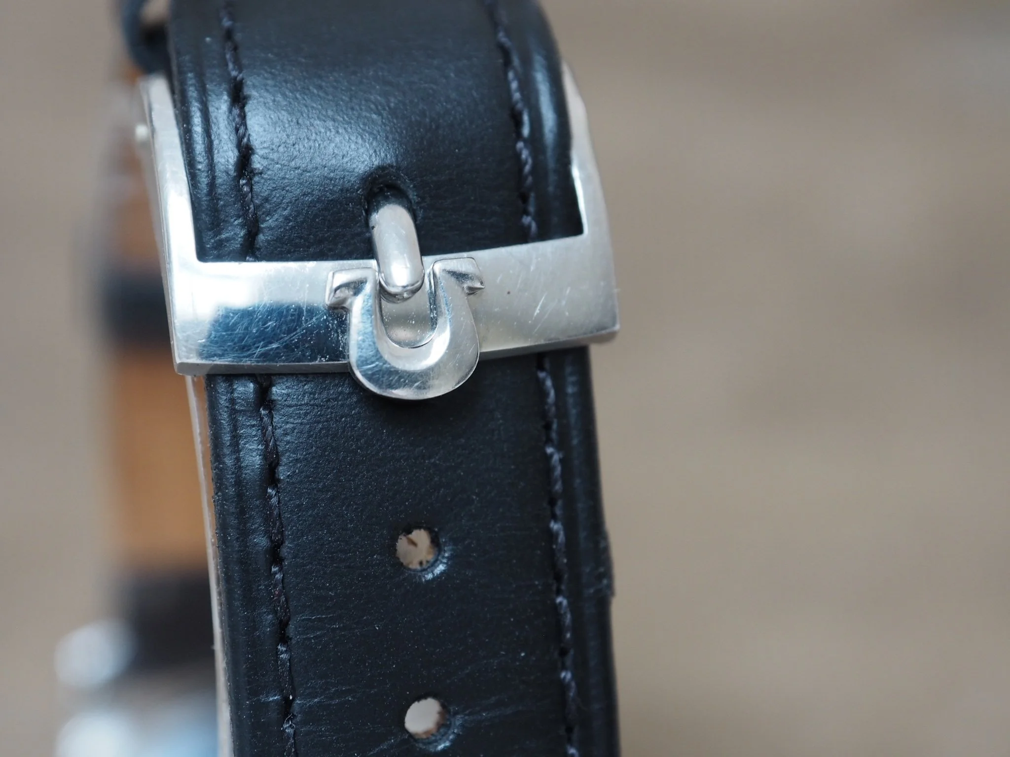 The watch is fitted with an aftermarket leather strap with Omega buckle.