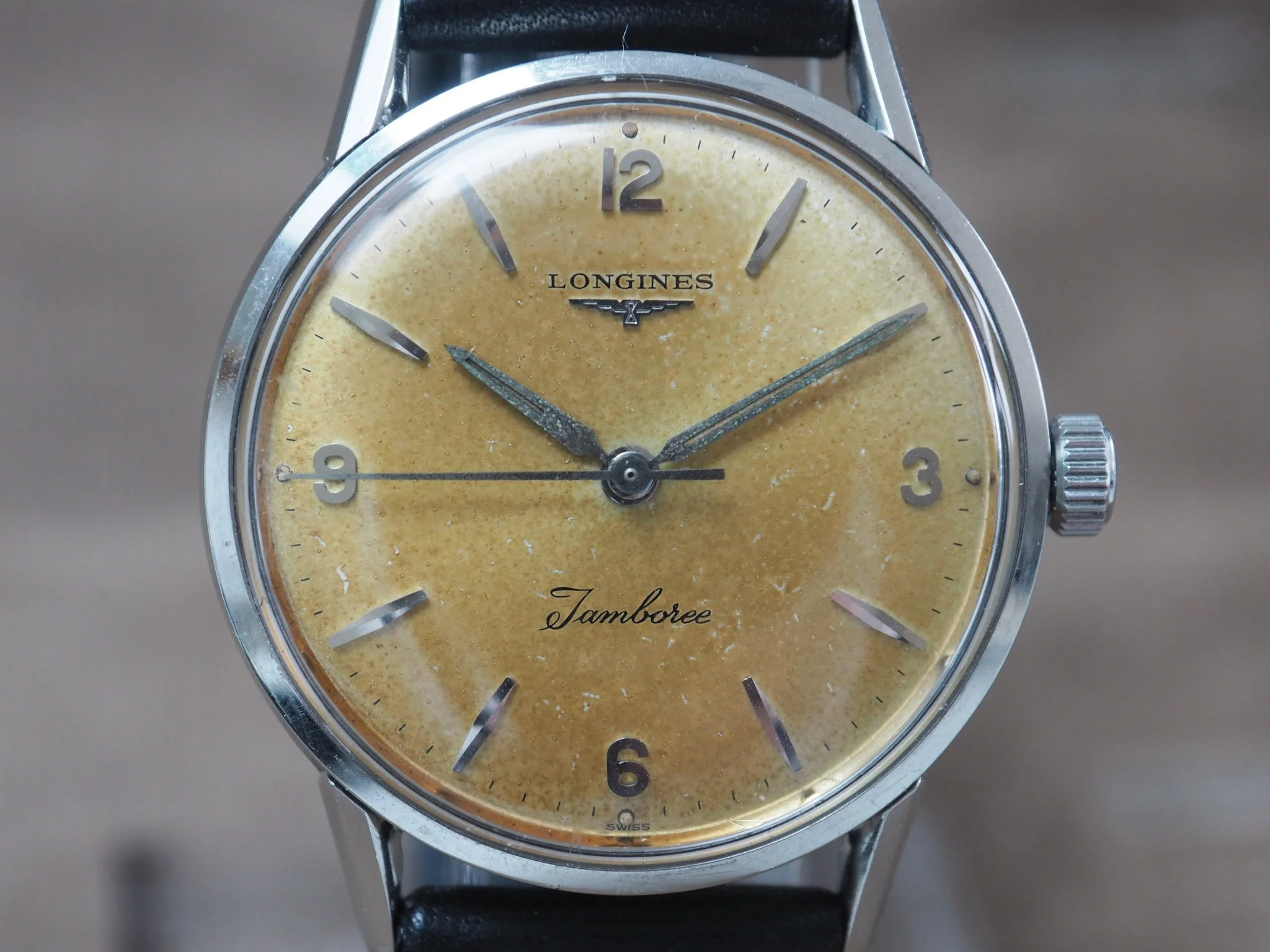 The watch features a beautifully aged dial with a rich, warm patina that has developed evenly across the surface, giving it real vintage character. Applied hour markers, the classic Longines winged logo, and the “Jamboree” script above 6 o’clock create a simple but striking design typical of the era.