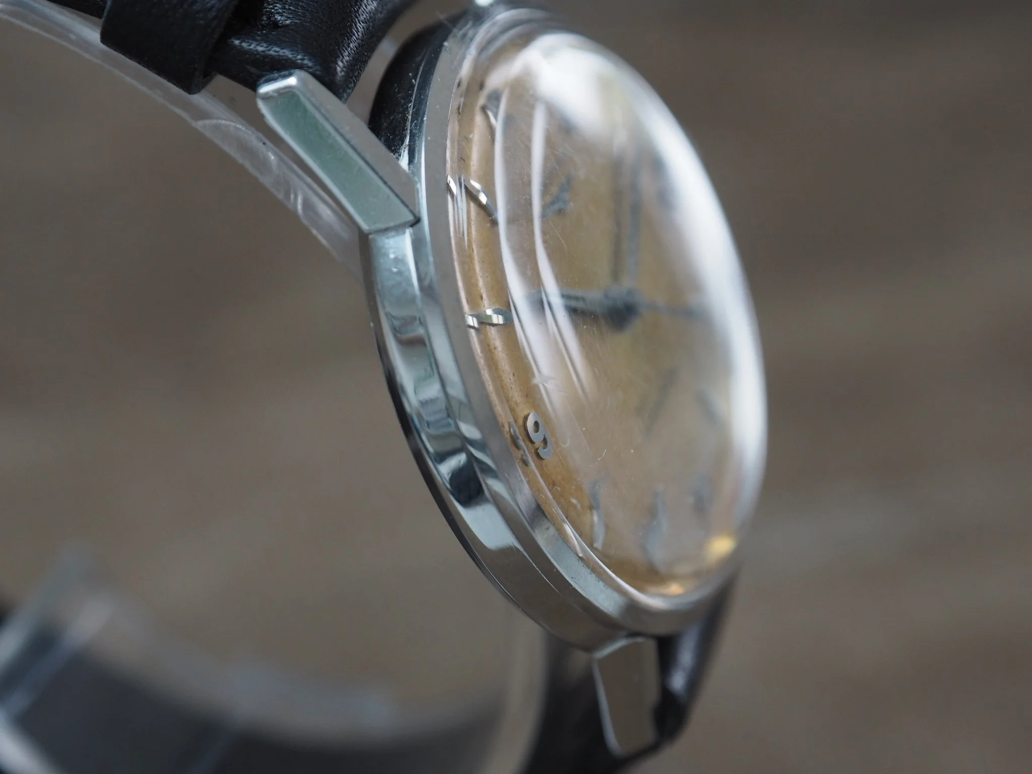 The stainless steel case presents well overall with some surface marks consistent with age and normal wear. The watch is fitted with an aftermarket crown.