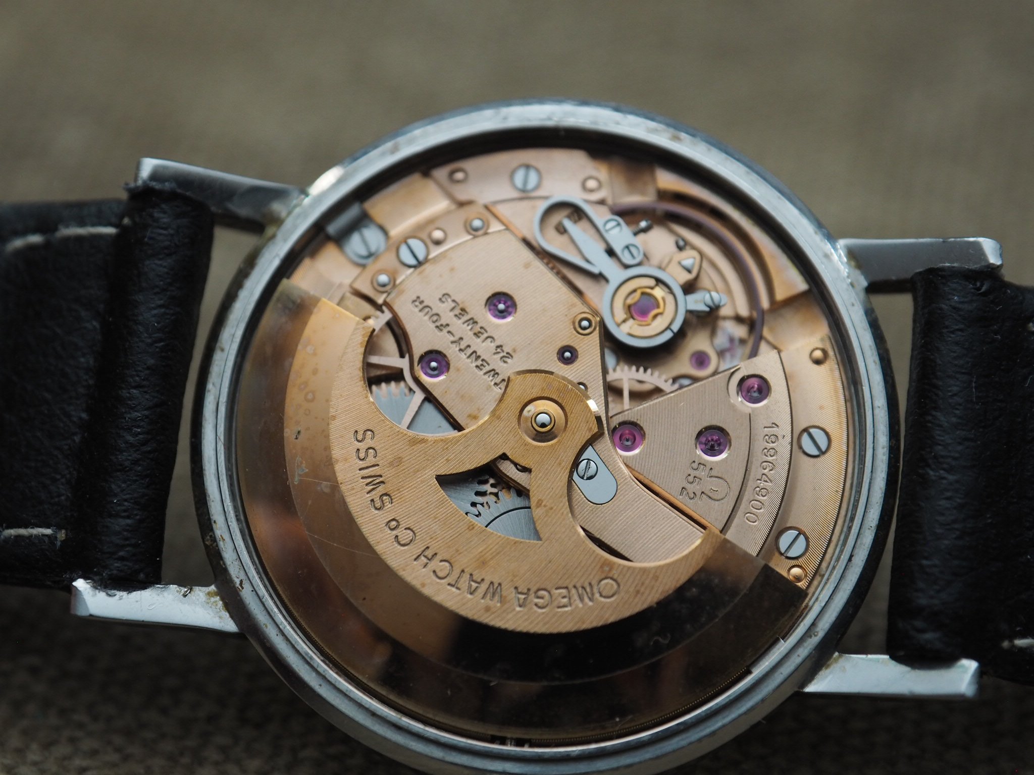 Calibre 552 movement is clean and running very well. High amplitude and low beat error on the timegrapher, keeping excellent time in testing. On an aftermarket black strap with a steel buckle.