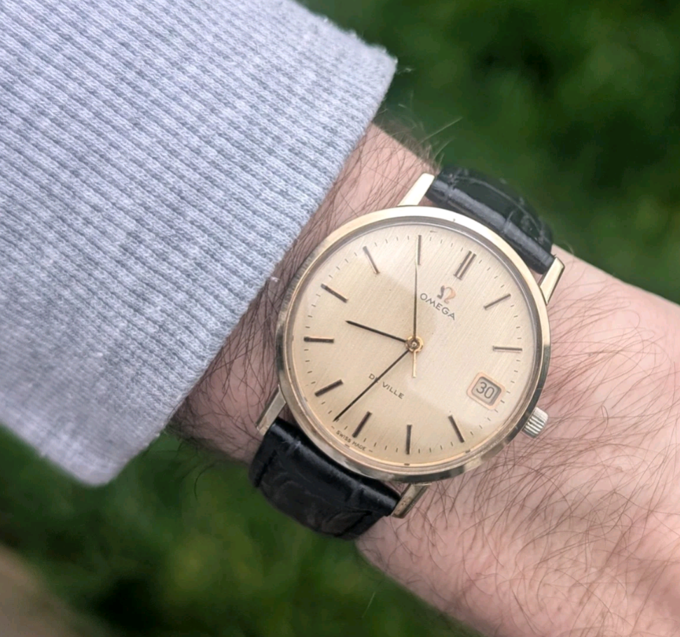 A refined and uncommon De Ville reference in solid gold, with a dial you don’t often see and a case style typical of Omega’s slim, dressy 1970s design.